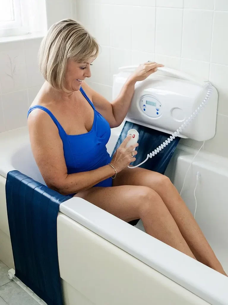 The easy-to-use controller makes using the Dolphin Batheasy™ simple and relaxing as you gently lower yourself down in comfort and safety. The layout of the unit is incredibly simple. You can choose to operate it by the push buttons on the front of the unit or by the hand held waterproof remote control. There is also a battery indicator to let you know when the battery needs recharging.